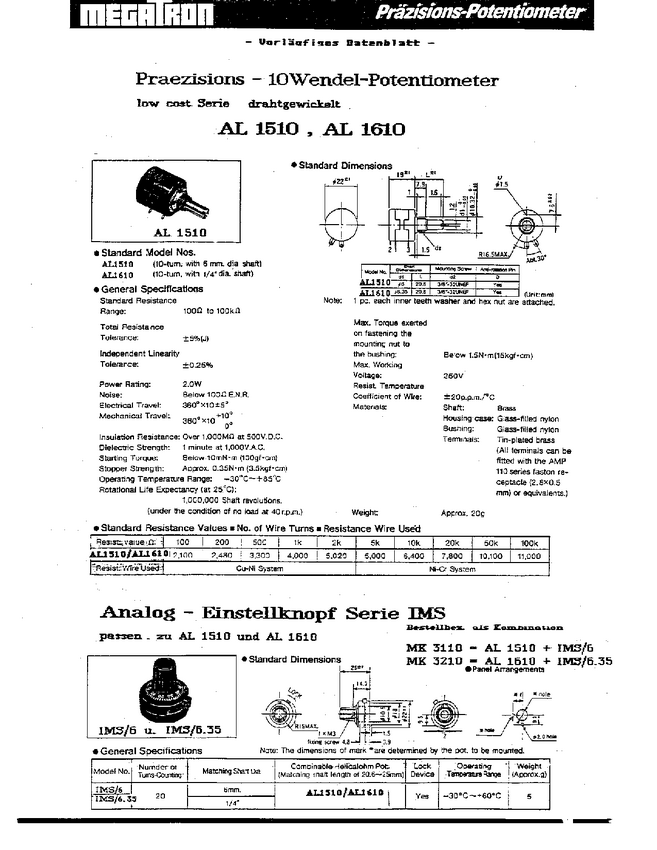 Potencjometr drutowy wieloobrotowy; Bushing 3/8-32UNEF; ośka 6,35 mm; długość ośki 20,6 mm lub dłuższa; średnica bębna 22,23mm gł. bębna 19 mm; Tolerancja rezystanc ji +-5% ale są wersje +-1%; liniowośc: +-0,25 % ale może być +- %; Trwałość dla 10 cio obrotowego AL1510/AL1610/AL1710/AL1910 = 22hp-10.. 22HPM-10.. - 1.000.000 cykli dla 5 obr. AL1505.. 500.000 cykli dla 3 obrotowego AL1503.. 300.000 cykli