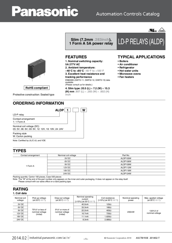 Przekaźnik; elektromagnetyczny; ALDP112; 12V DC; 5A; 30V DC; SPST-NO 1 styk zwierny; PANASONIC; = G5NB-1A4-12DC, HF46F-012-HS1T, 202H-1AH-F-C-12VDC; RoHS