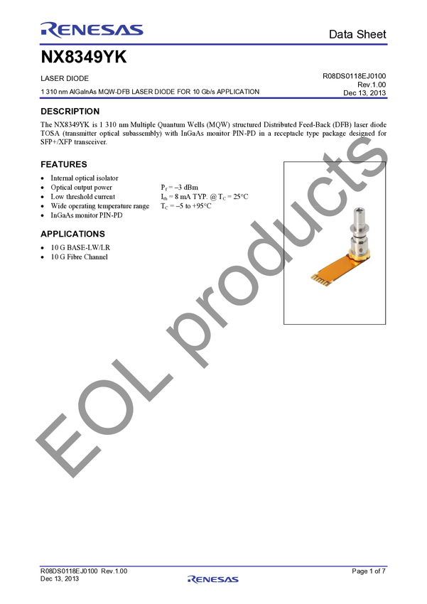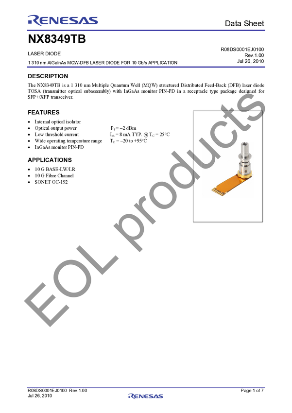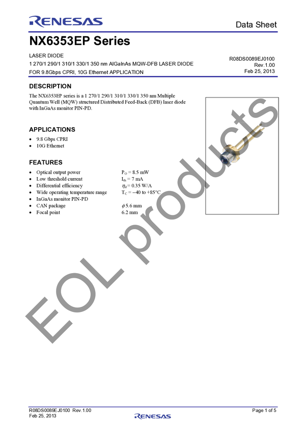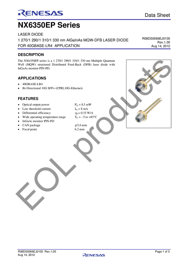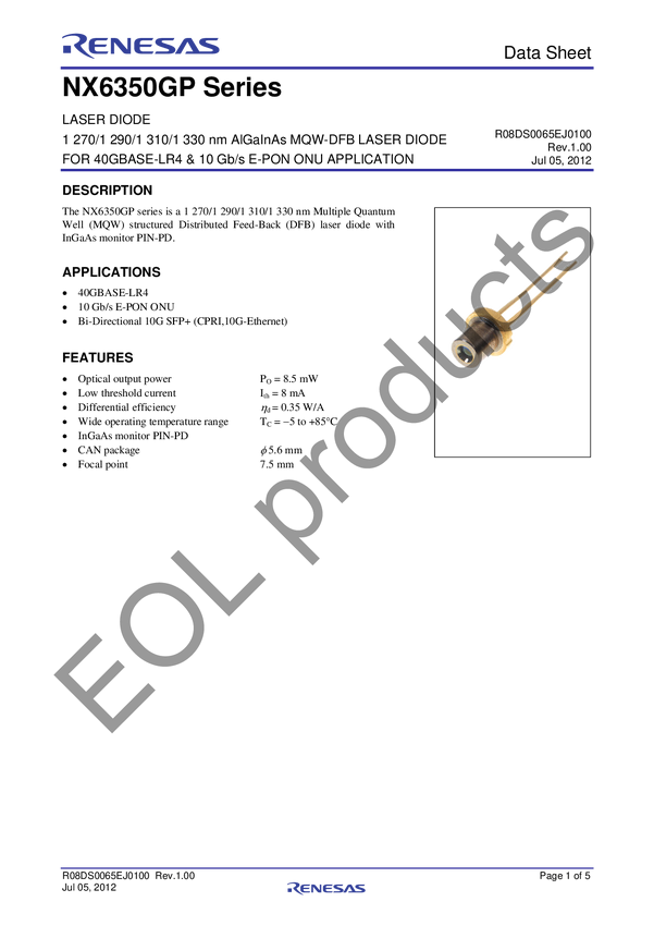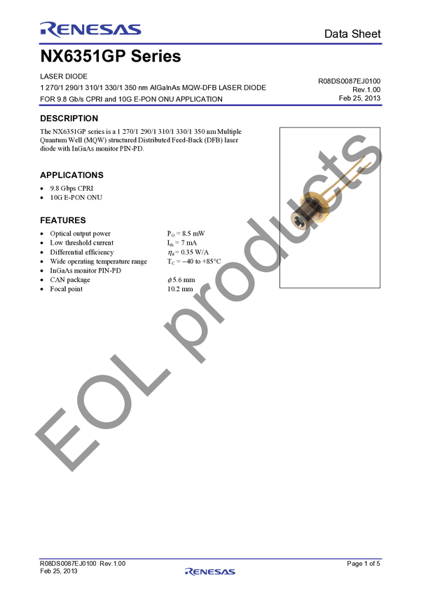 270/1 290/1 310/1 330/1 350 nm AlGaInAs MQW-DFB Laser Diode for 9.8 Gb/s CPRI and 10G E-PON ONU Application