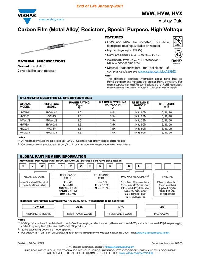 Carbon Film (Metal Alloy) Resistors, Special Purpose, High Voltage