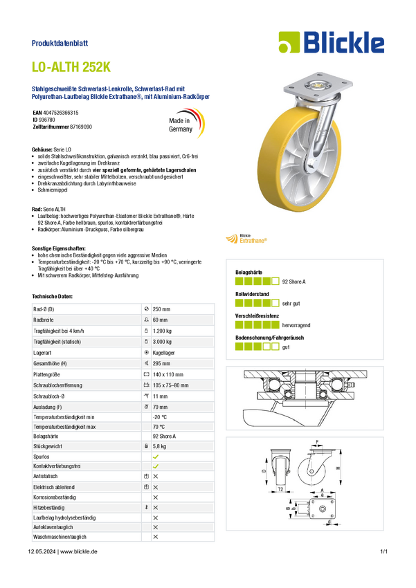 Blickle 936780 LO-ALTH 252K Koło obrotowe do dużych obciążeń Średnica koła: 250 mm Maksymalne obciążenie: 1200 kg 1 szt.
