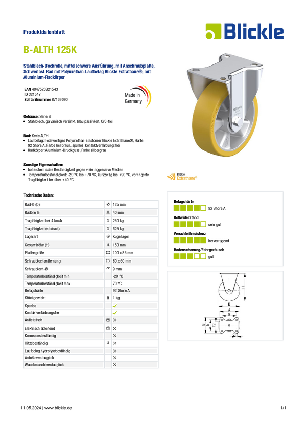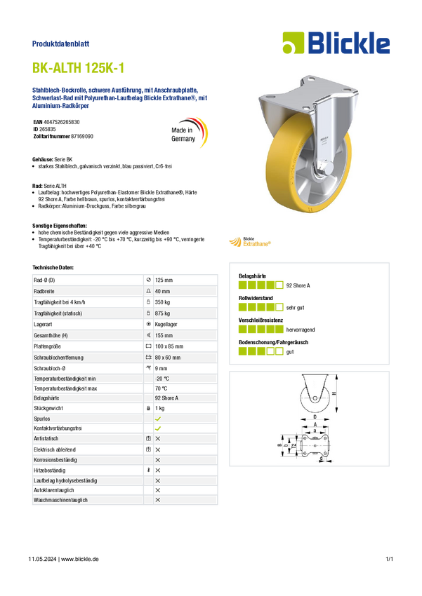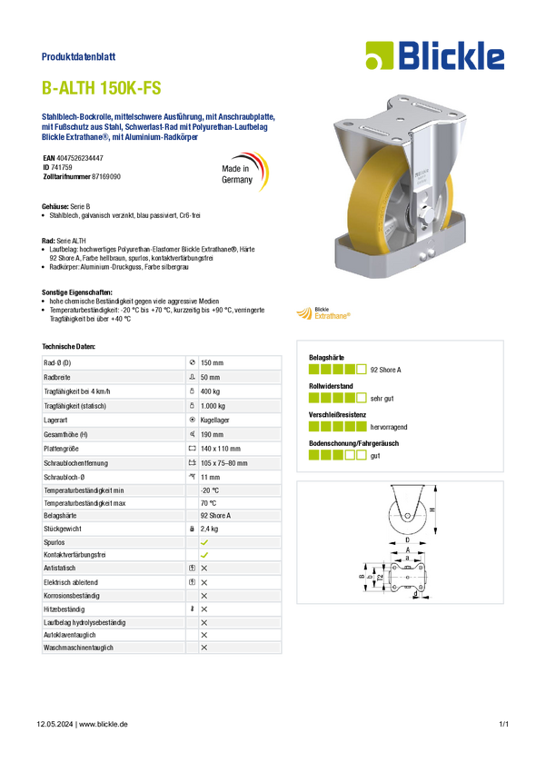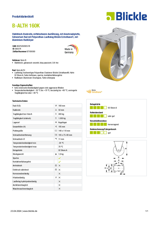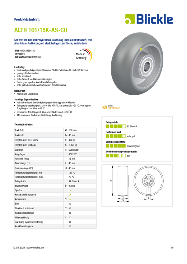 Blickle 936586 ALTH 101/15K-AS-CO Koło do dużych obciążeń Średnica koła: 100 mm Maksymalne obciążenie: 420 kg 1 szt.