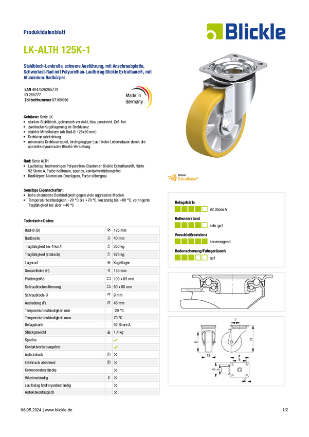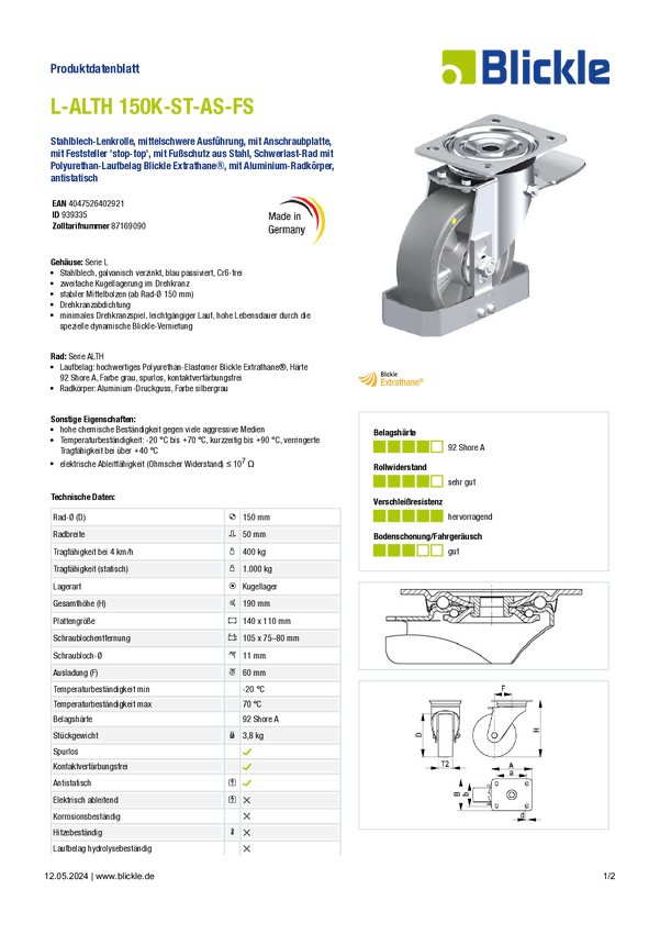 Blickle 939335 L-ALTH 150K-ST-AS-FS Rolka obrotowa z blachy stalowej Średnica koła: 150 mm Maksymalne obciążenie: 400 kg