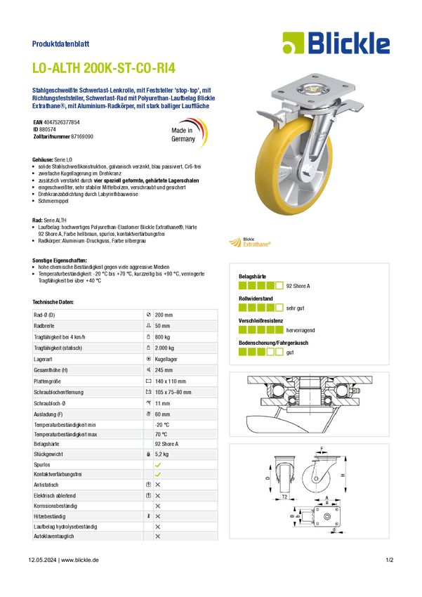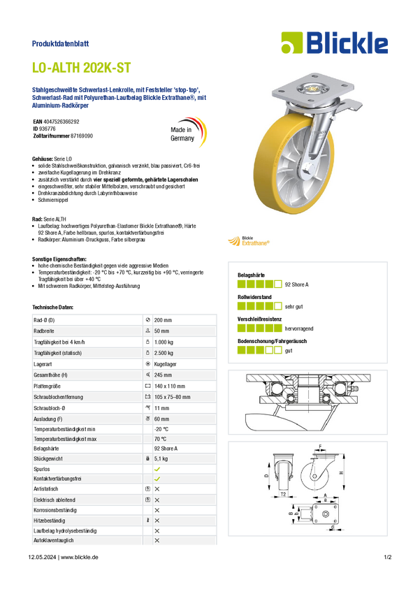 Blickle 936776 LO-ALTH 202K-ST Koło obrotowe do dużych obciążeń Średnica koła: 200 mm Maksymalne obciążenie: 1000 kg 1 s