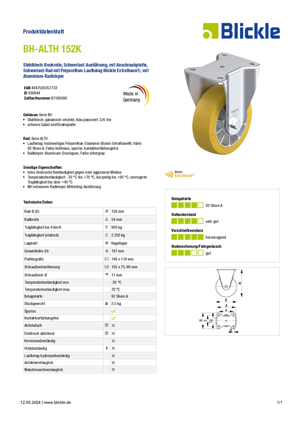 Blickle 936644 BH-ALTH 152K Koło stałe z blachy stalowej Średnica koła: 150 mm Maksymalne obciążenie: 900 kg 1 szt.