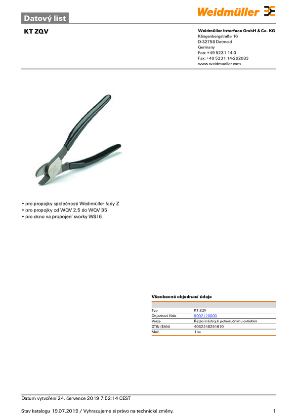 Weidmüller KT ZQV 9002170000 Obcinak do kabli Odpowiedni do kabli aluminiowych lub miedzianych, jedno i wielożyłowych