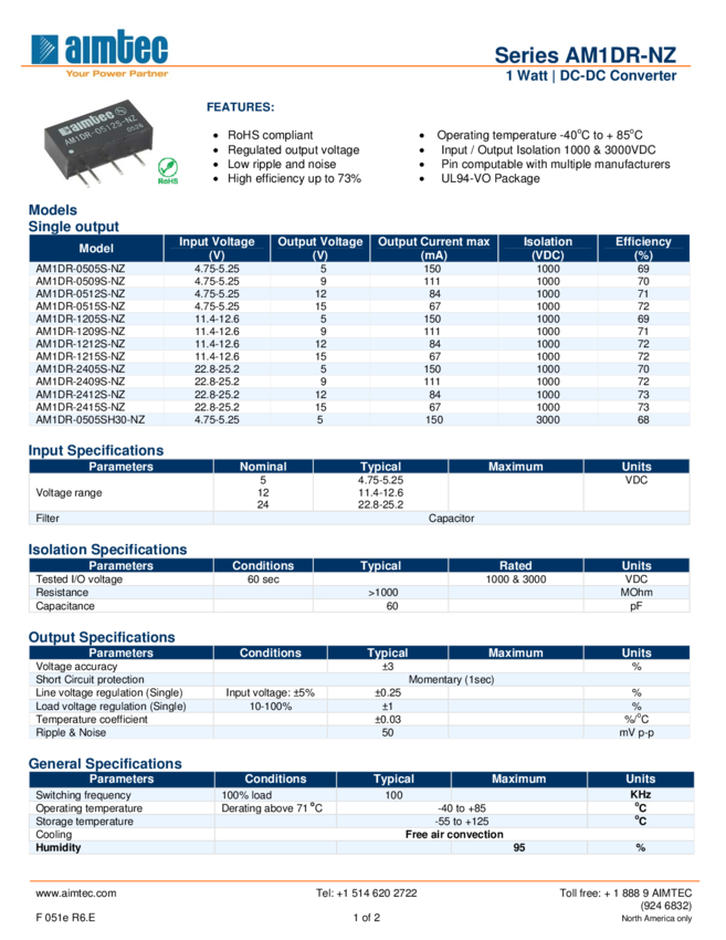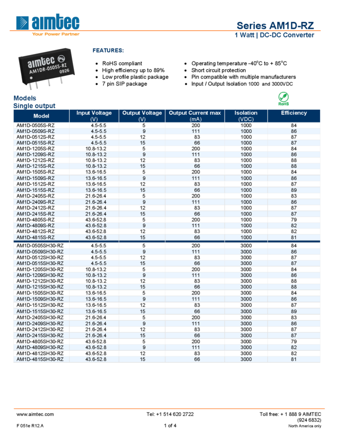 Module DC-DC 1-OUT 12V 0.084A 1W 4-Pin SIP