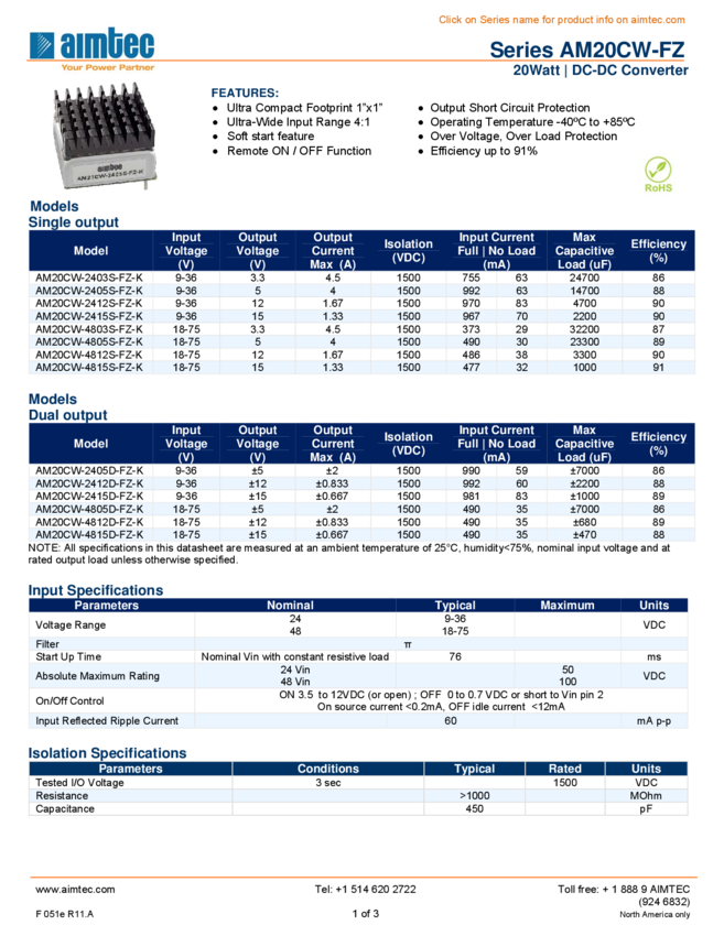 Module DC-DC 1-OUT 12V 1.667A 15W 6-Pin DIP Tube