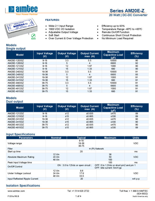 Module DC-DC 1-OUT 5V 4A 20W 6-Pin Bulk