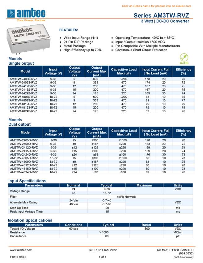 Module DC-DC 2-OUT ±12V ±0.125A 3W 13-Pin DIP