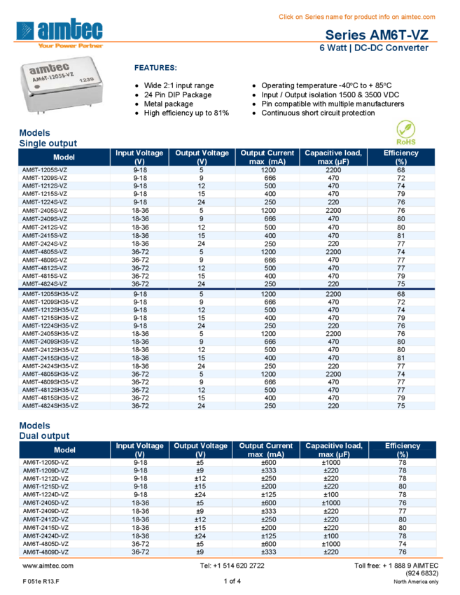 Module DC-DC 1-OUT 7.2V 0.833A 6W 12-Pin DIP Bulk
