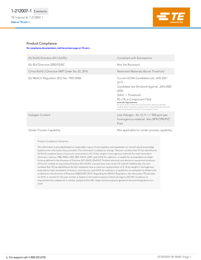 TE Connectivity 1-212007-1 TE AMP AMPLIMITE - Aerospace & Military, 1 szt.