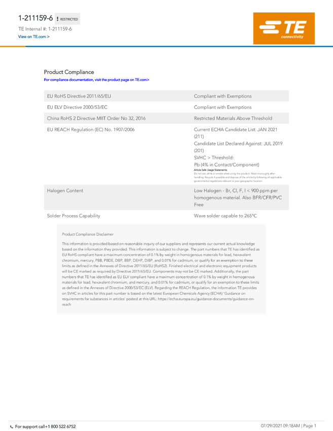 TE Connectivity 1-211159-6 TE AMP AMPLIMITE - Aerospace & Military, 1 szt.