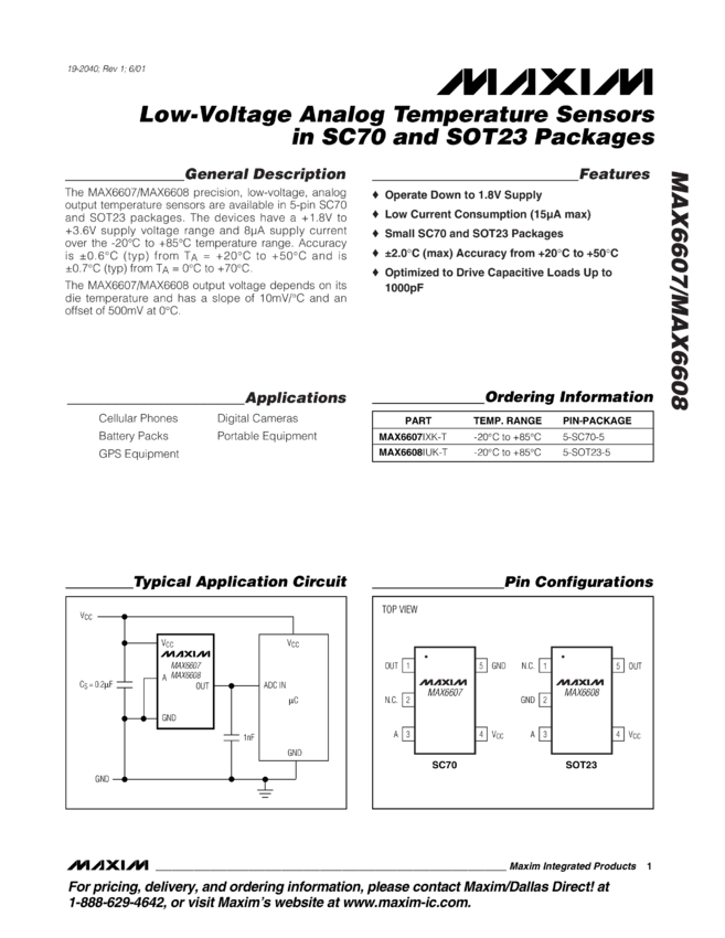 MAX6607, MAX6608 Low-Voltage Analog Temperature Sensors in SC70 and SOT23 Packages