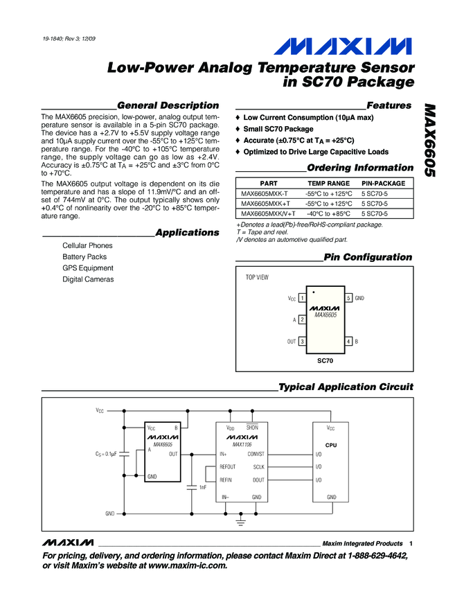 MAX6605 Low-Power Analog Temperature Sensor in SC70 Package