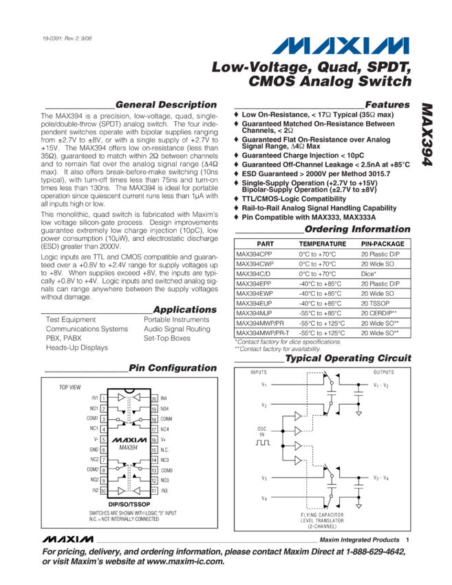 MAX394 Low-Voltage, Quad, SPDT, CMOS Analog Switch—Replaces MAX333A