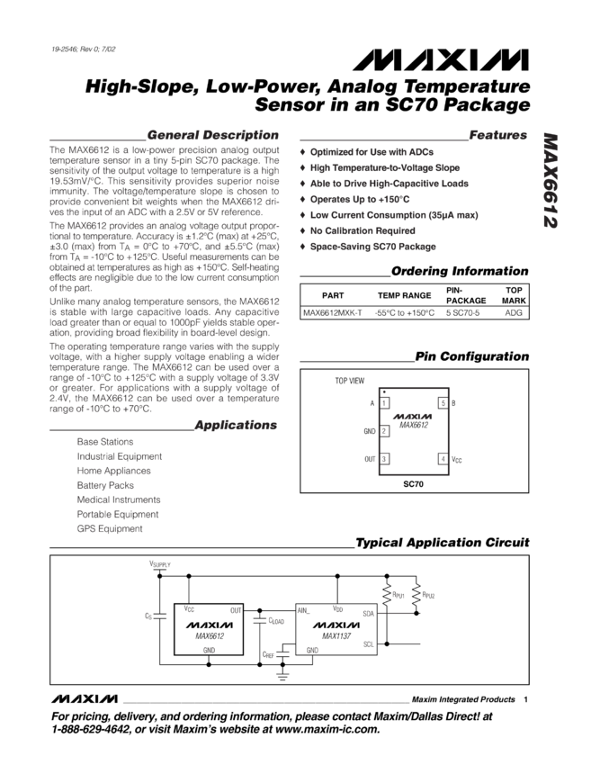 MAX6612, MAX6612MXK High-Slope, Low-Power, Analog Temperature Sensor in an SC70 Package