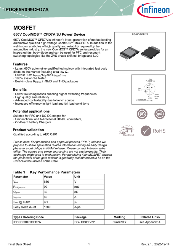 650 V CoolMOS™ CFD7A N-channel automotive SJ power MOSFET in HDSOP-22 top-side cooling The 125mΩ IPDQ65R125CFD7A in QDPAK top side cooling SMD package is part of the automotive-qualified 650 V CoolMOS™ SJ power MOSFET CFD7A product family. As compared to the previous generation, CoolMOS™ CFD7A offers higher reliability and power density while increasing design flexibility. Top side cooling further supports increased power density, reduces parasitic source inductance and comes with Kelvin source pin and3.2