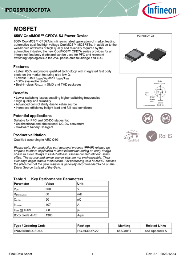 650 V CoolMOS™ CFD7A N-channel automotive SJ power MOSFET in HDSOP-22 top-side cooling The 80mΩ IPDQ65R080CFD7A in QDPAK top side cooling SMD package is part of the automotive-qualified 650 V CoolMOS™ SJ power MOSFET CFD7A product family. As compared to the previous generation, CoolMOS™ CFD7A offers higher reliability and power density while increasing design flexibility. Top side cooling further supports increased power density, reduces parasitic source inductance and comes with Kelvin source pin and3.2 m
