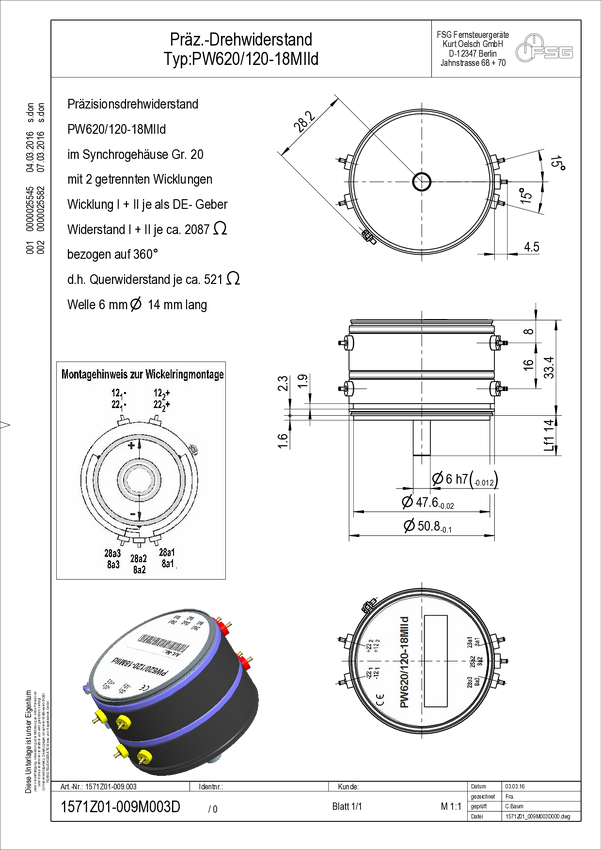 Moc 2,5W; lin 0,5-0,1%; 17ppm; 1570z02-001.106 drutowy Precision Angular Position Transmitter PW620-18d servo mount size 20 winding angle 360° wiper rotatable without limit stops reactive winding 240° resistance 1 kohm ± 1% / 120° shaft 6 mm Ý length from support 14 mm torque 3 10 cmp or 3 0,1 Ncm serwo 2" ośka 6mm, dł.ośki 12 mm; rez.1 k - podobne : PM*CP*50* i PM*FCP50A* na bazie korpusu Sakae można wykonać na zamówienie Średnica 50,8mm; gł. 17,4mm; ośka 6mm dł 12 ( 14 ) mm; elektryczny kąt pracy