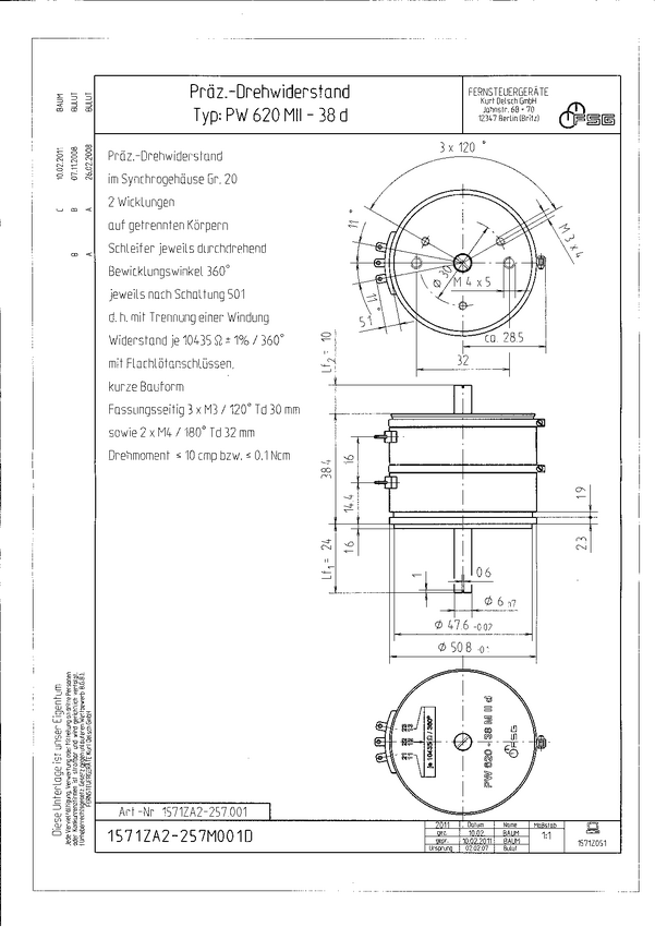 Precision Angular Position Potentiometer PW620 1571Z80-269.001 1571Z80-269.001 Precision Angular Position Transmitter PW620/90-42MIId in servo casing size 20 with 2 isolated windings on isolated winding bodies winding each 360° wiper rotate without limit stops each with 4 at 90° shifted tappings each with 2 at 90° shifted wipers resistance each approx. 5217 ? shunt resistor each approx. 1304 ? sense of rotation right with flat solder connection short design shaft 6 mm Ý 14 mm long ship's design, that means