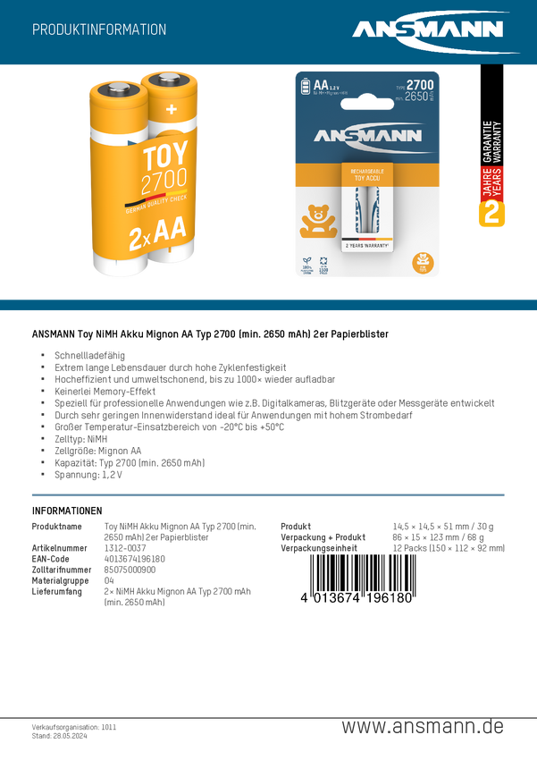 Akumulator AA/R06 Ansmann 1312-0037 1312-0037, NiMH, 2650 mAh, 1.2 V, 2 szt.