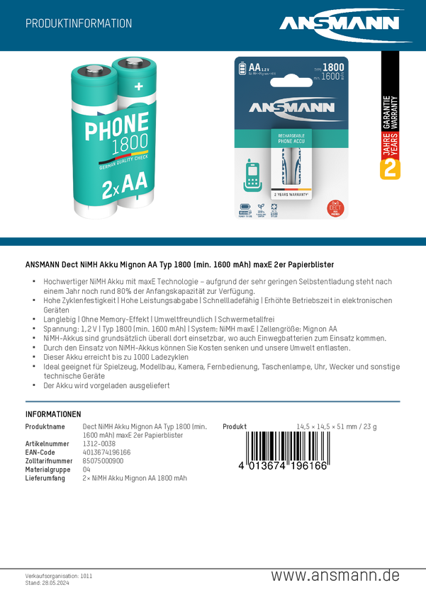 Akumulator AA/R06 Ansmann 1312-0038 1312-0038, NiMH, 1600 mAh, 1.2 V, 2 szt.