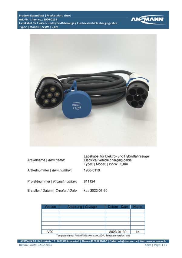Kabel do ładowania samochodów elektrycznych Ansmann 1900-0119 5 m