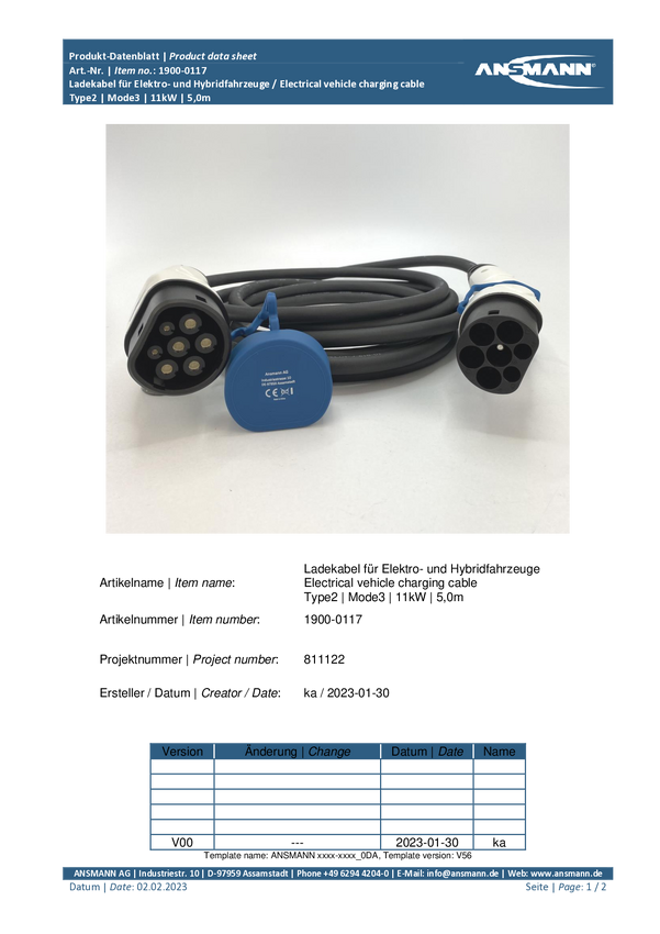Kabel do ładowania samochodów elektrycznych Ansmann 1900-0117 5 m