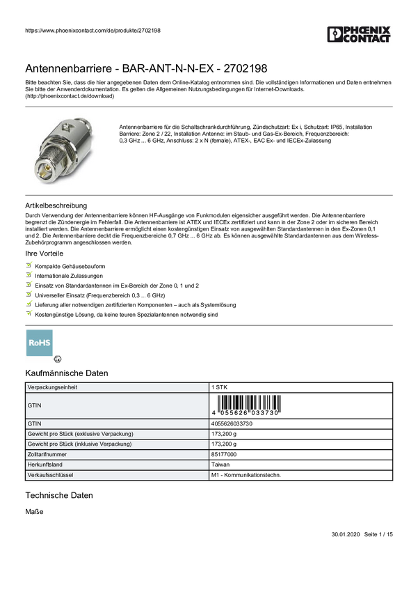 Bariera anteny Phoenix Contact BAR-ANT-N-N-EX