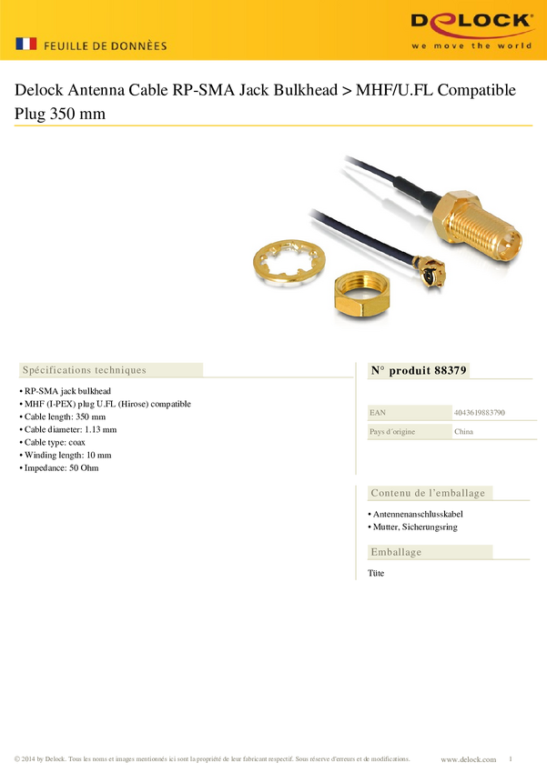 Kabel przedłużający anteny Wi-Fi Delock 88379, [1x Złącze męskie IPEX - 1x Złącze żeńskie RP-SMA], 0.30 m, Rodzaj złącza