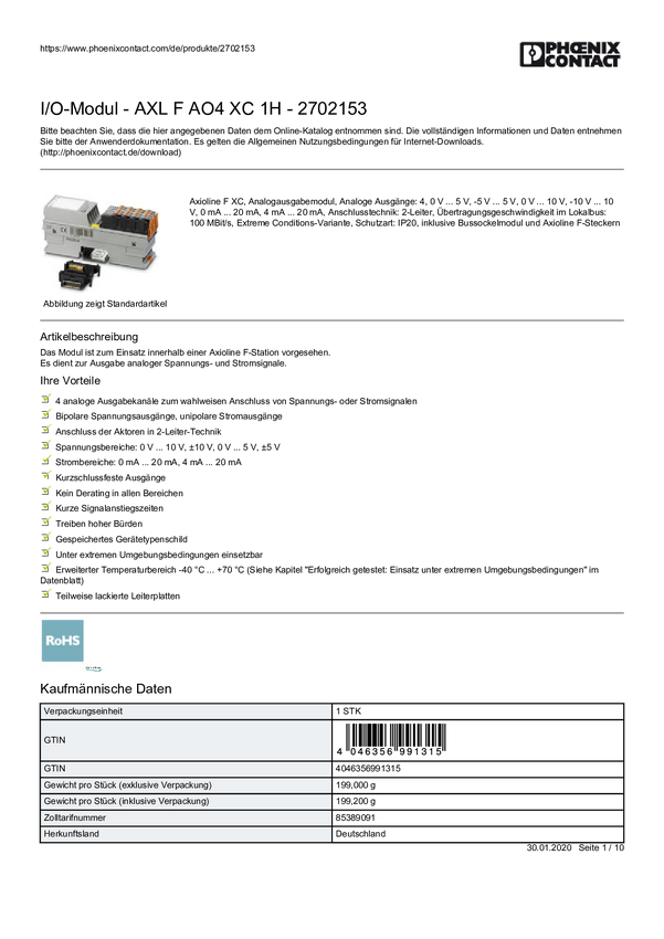 Phoenix Contact AXL F AO4 XC 1H 2702153 Moduł I/O 5 V/DC