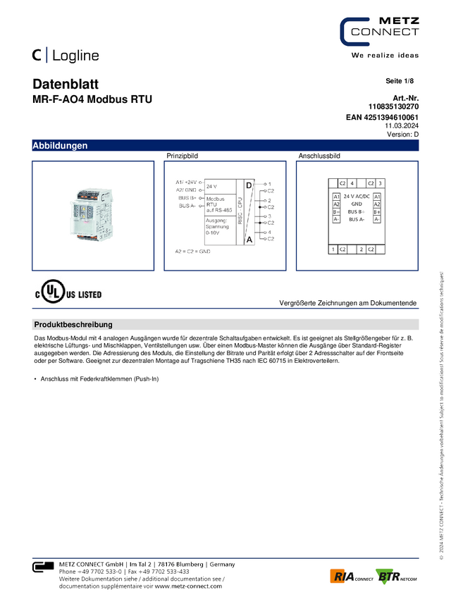 Metz Connect MR-F-AO4 Modbus RTU 110835130270 24 V/AC, 24 V/DC 50 mA Ilość wyjść:4 x