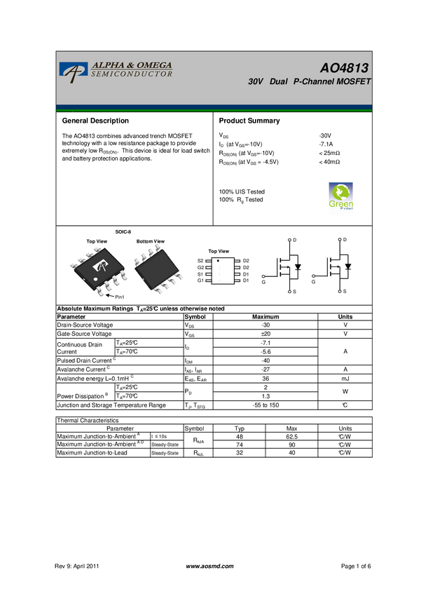 Tranzystor; AO4813; P-MOSFET x2; unipolarny; -30V; -7,1A; 2W; 40mOhm; SO8; SMD; ALPHAΩ RoHS; opakowanie/100szt