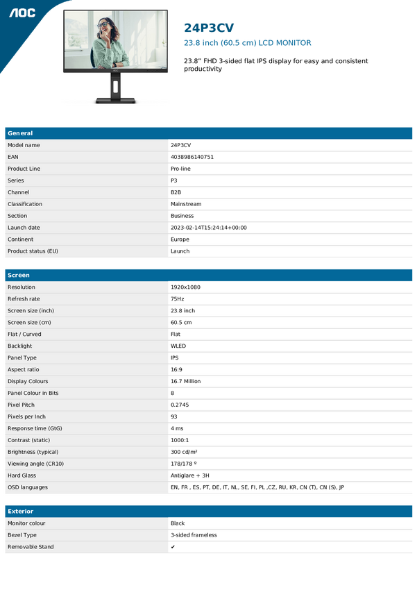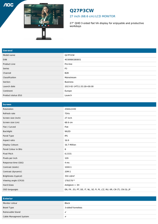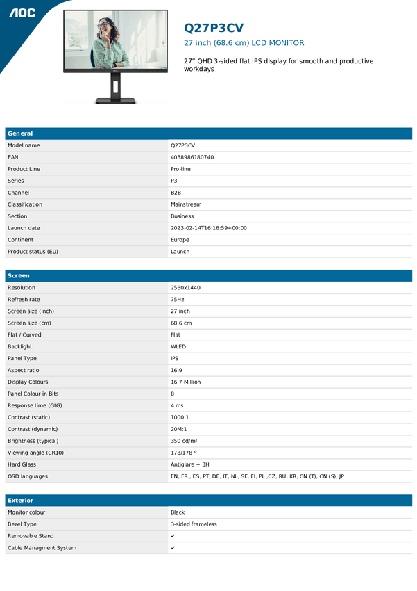 AOC QPro-Line 27P3QW Monitor EEK E (A - G) 68.6 cm (27 cal) 2560 x 1440 px 16:9 4 ms HDMI, DisplayPort, USB 3.1, USB-B,