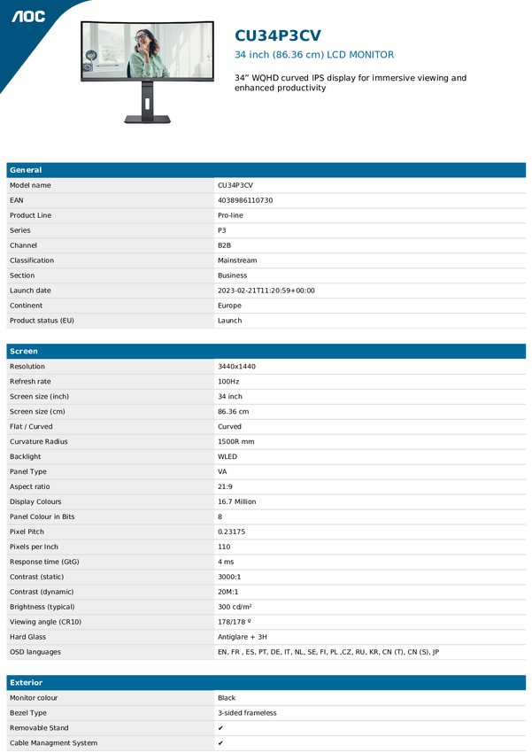 AOC AOC Pro-line CU34P3CV - Seria P3 - LED