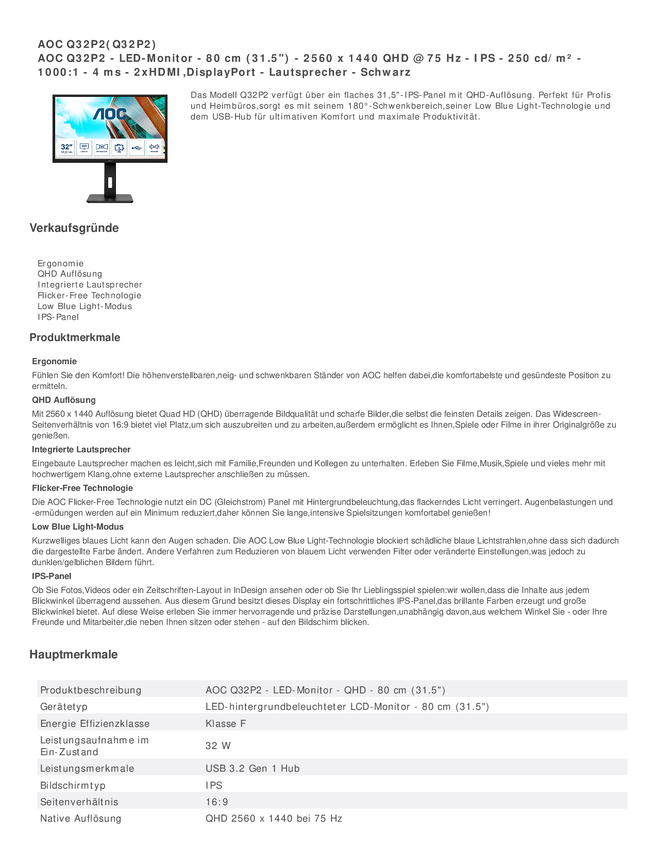 AOC Q32P2 Monitor EEK F (A - G) 80 cm (31.5 cal) 2560 x 1440 px 16:9 4 ms HDMI, DisplayPort, USB 3.2 Gen 1, gniazdo słuc