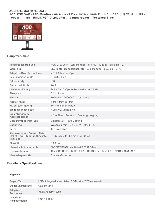 AOC AOC 27E3QAF - Monitor LED - 68,6 cm (27"