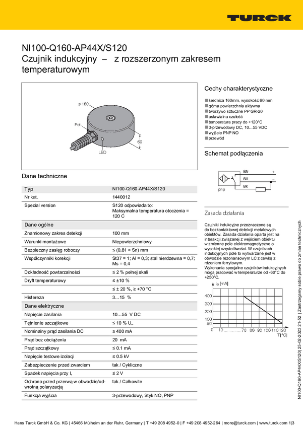 Turck Czujnik indukcyjny nie podtynkowy PNP, Zamykający NI100-Q160-AP44X/S120
