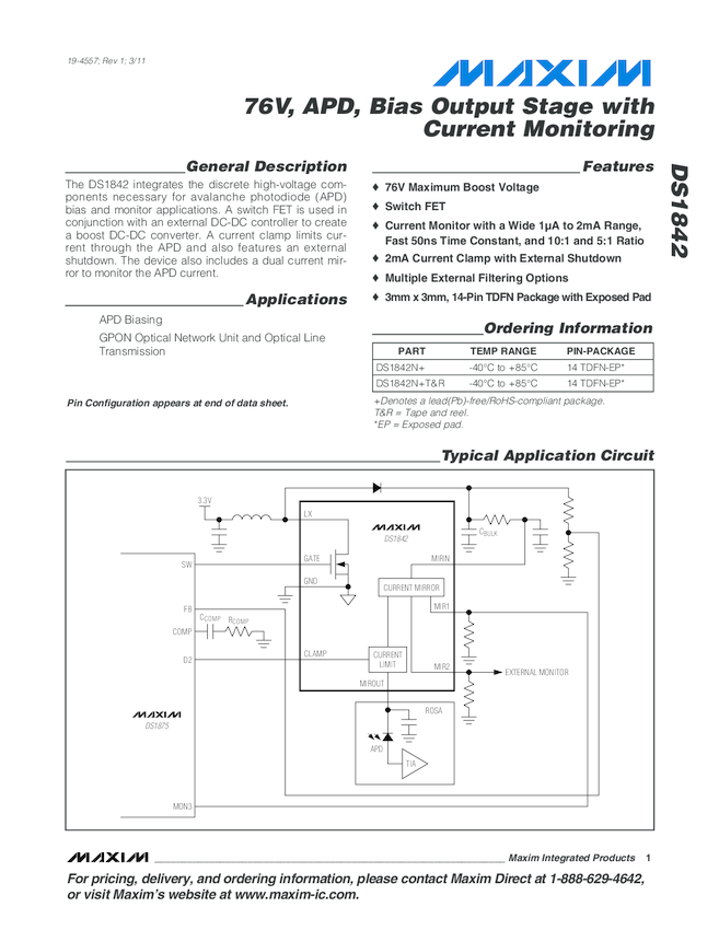 DS1842 76V, APD, Bias Output Stage with Current Monitoring