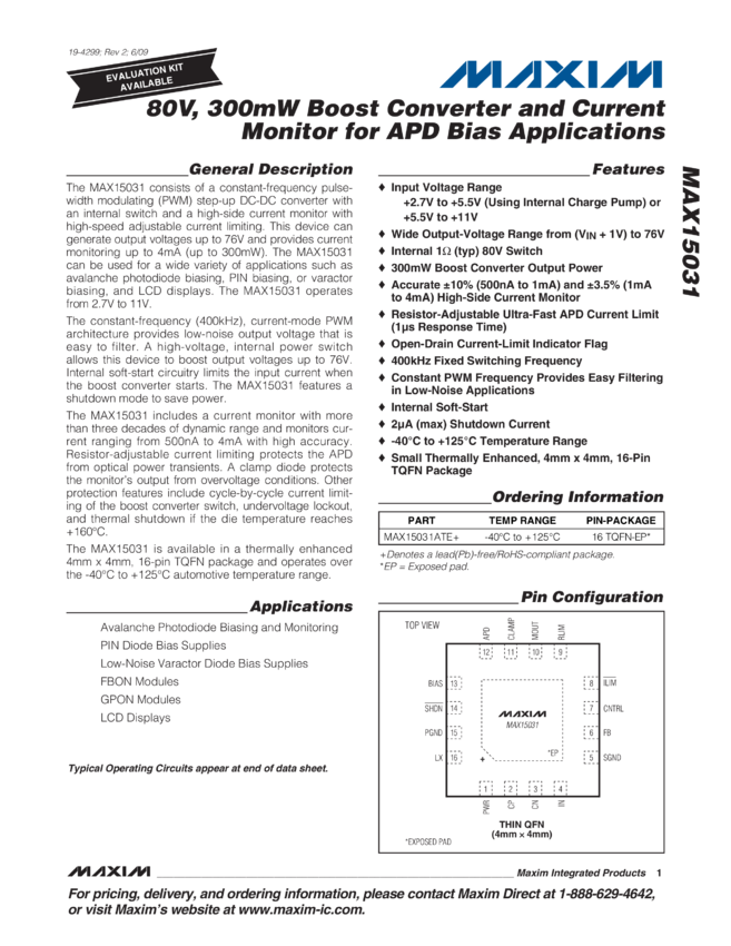 MAX15031 80V, 300mW Boost Converter and Current Monitor for APD Bias Applications