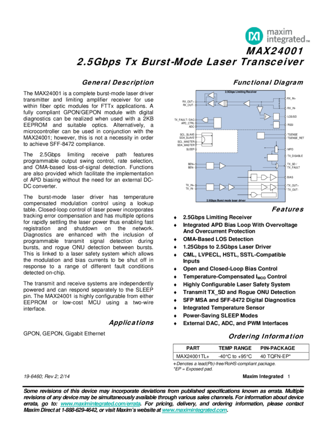 MAX24001 2.5Gbps Tx Burst Mode Laser Transceiver with integrated APD controller