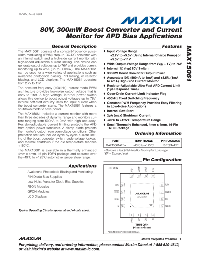 MAX15061 80V, 300mW Boost Converter and Current Monitor for APD Bias Applications