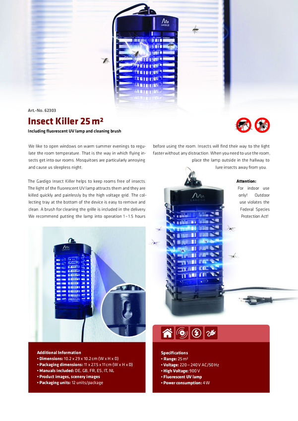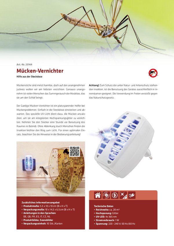 Gardigo UV-Stecker Mücken-Abwehr 25144DEFR Pułapka UV na komary światło UV, siatka elektryczna 0.7 W (D x S x W) 100 x 1