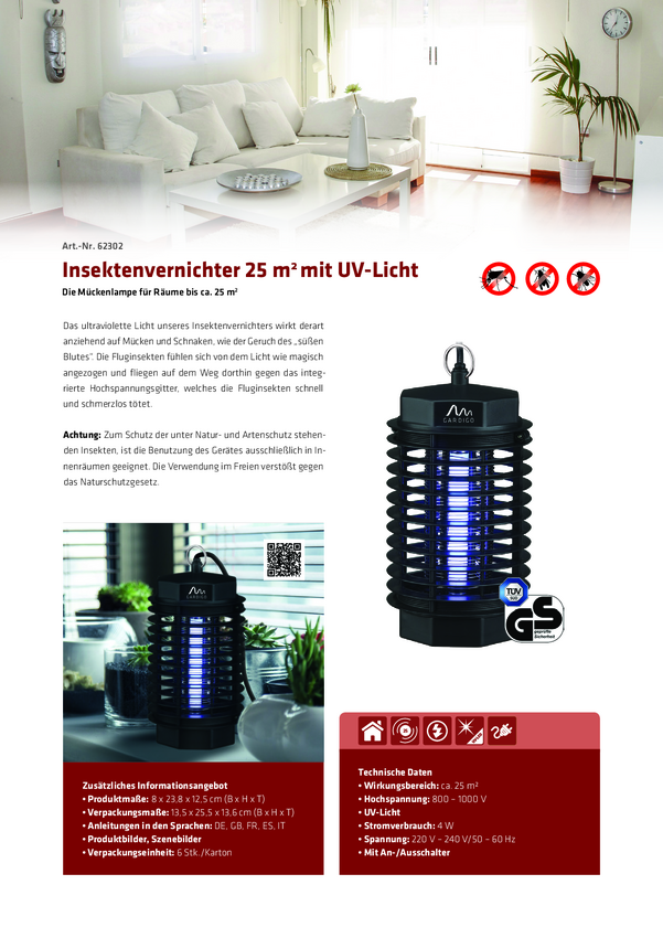 Gardigo Jr.50 62302 Pułapka UV na komary światło UV, siatka elektryczna 4 W (Ø x W) 120 mm x 238 mm czarny 1 szt.