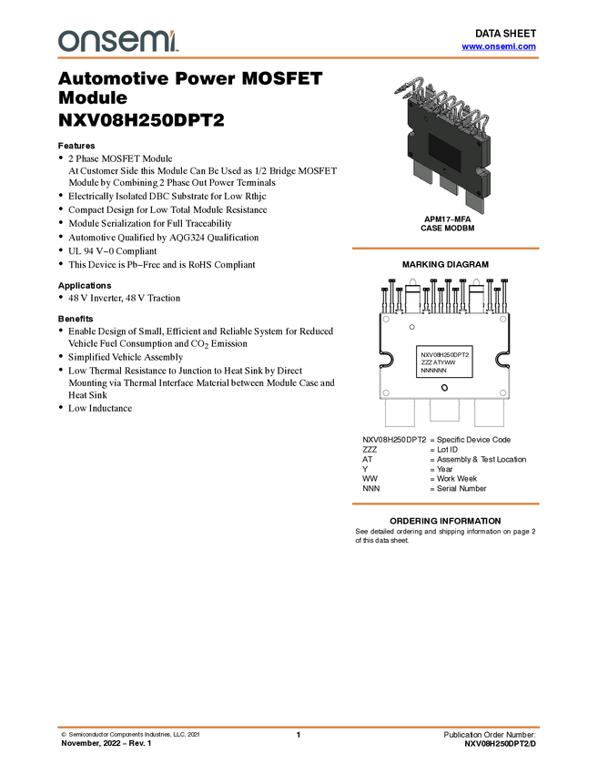 EliteSiC Power Module for OBC, 40mΩ, 1200V, 27 A, Dual Half-Bridge, in APM32 Series