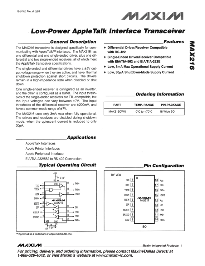 MAX216 Low-Power, AppleTalk™ Interface Transceiver