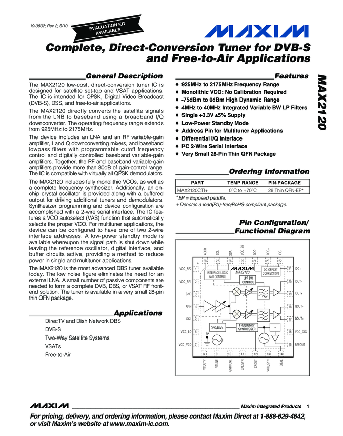 MAX2120 Complete, Direct-Conversion Tuner for DVB-S and Free-to-Air Applications