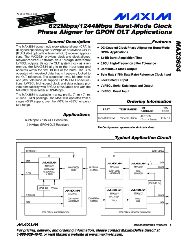 MAX3634 622Mbps/1244Mbps Burst-Mode Clock Phase Aligner for GPON OLT Applications