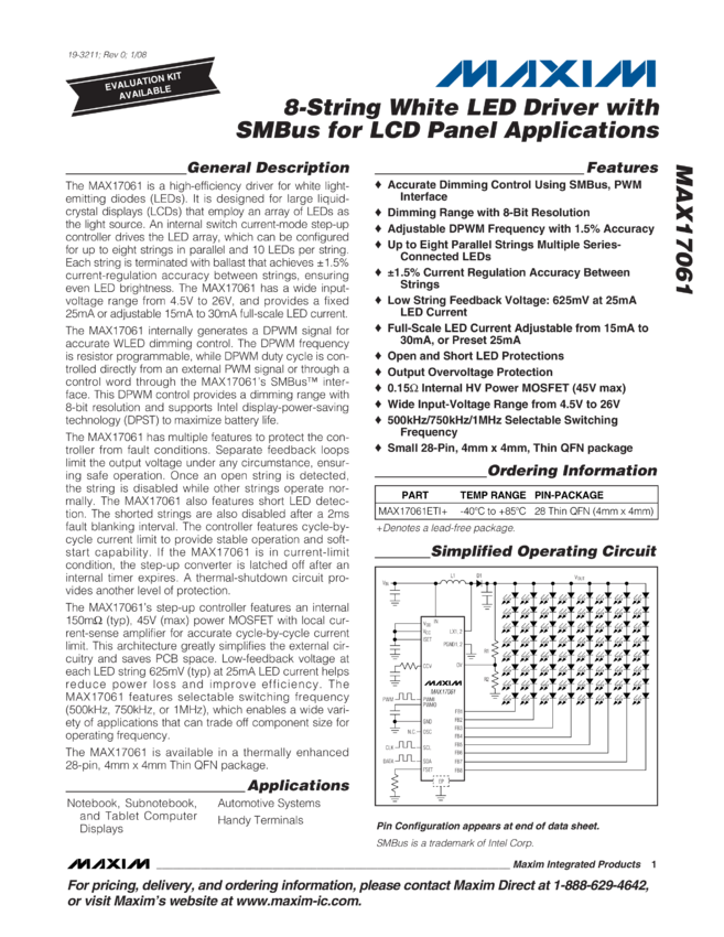 MAX17061 8-String White LED Driver with SMBus for LCD Panel Applications